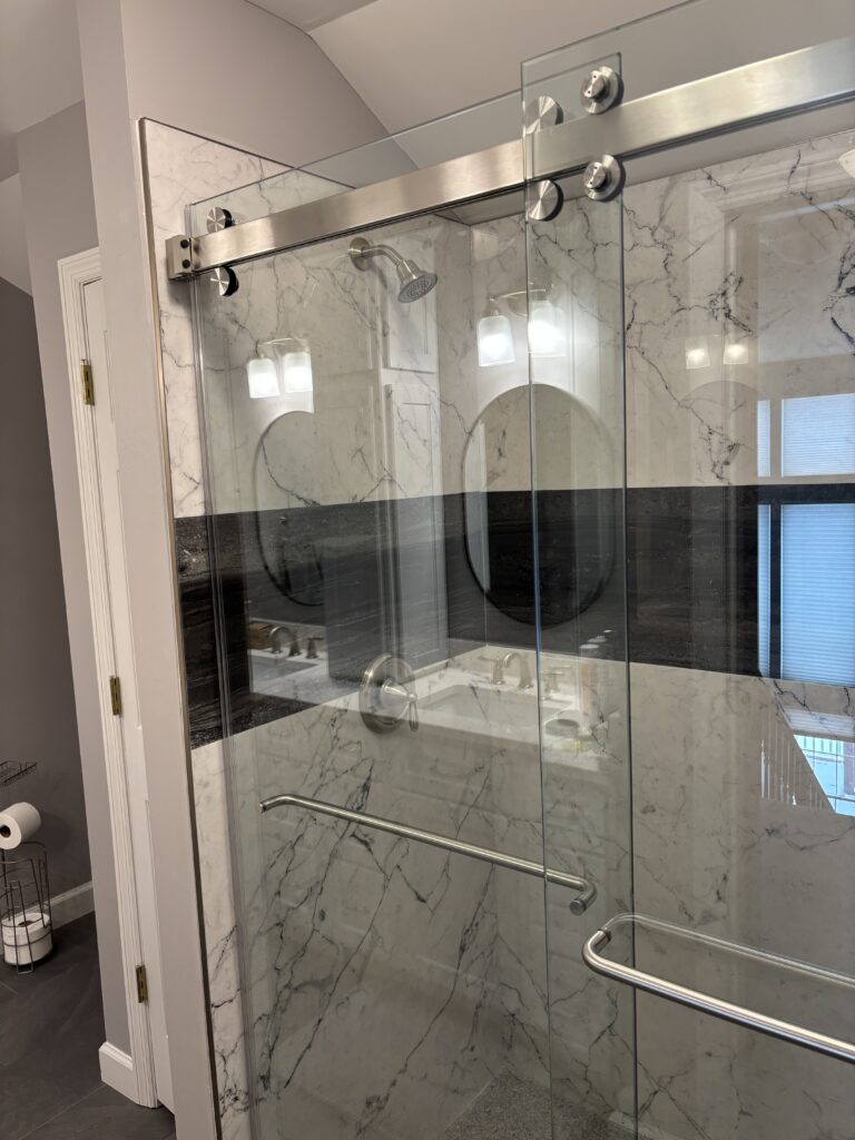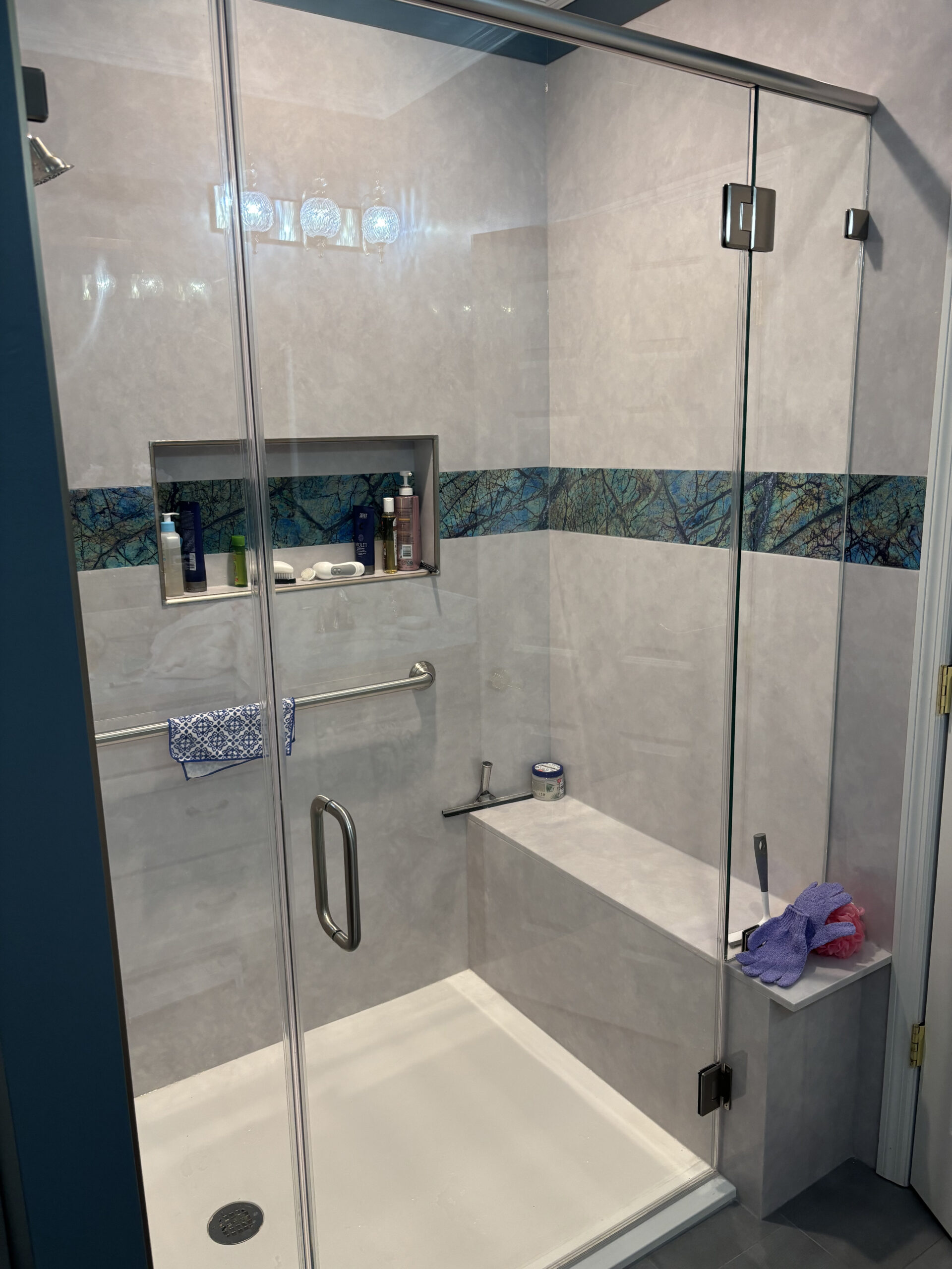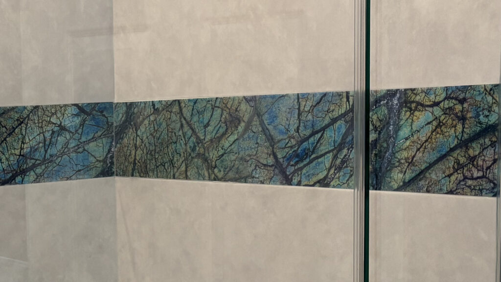 These recent bathroom renovations all feature gorgeous Tyvarian shower walls with an accent band.